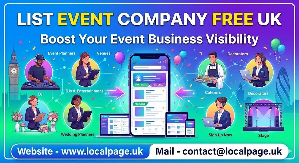 Local Page UK offers free wedding vendor listing UK options for venues and planners. This is an essential tool for wedding planners UK looking to grow their business. By add event business to directory UK, you ensure your agency is visible to couples searching for the best wedding venues UK in your specific region, boosting your visibility during their research phase.